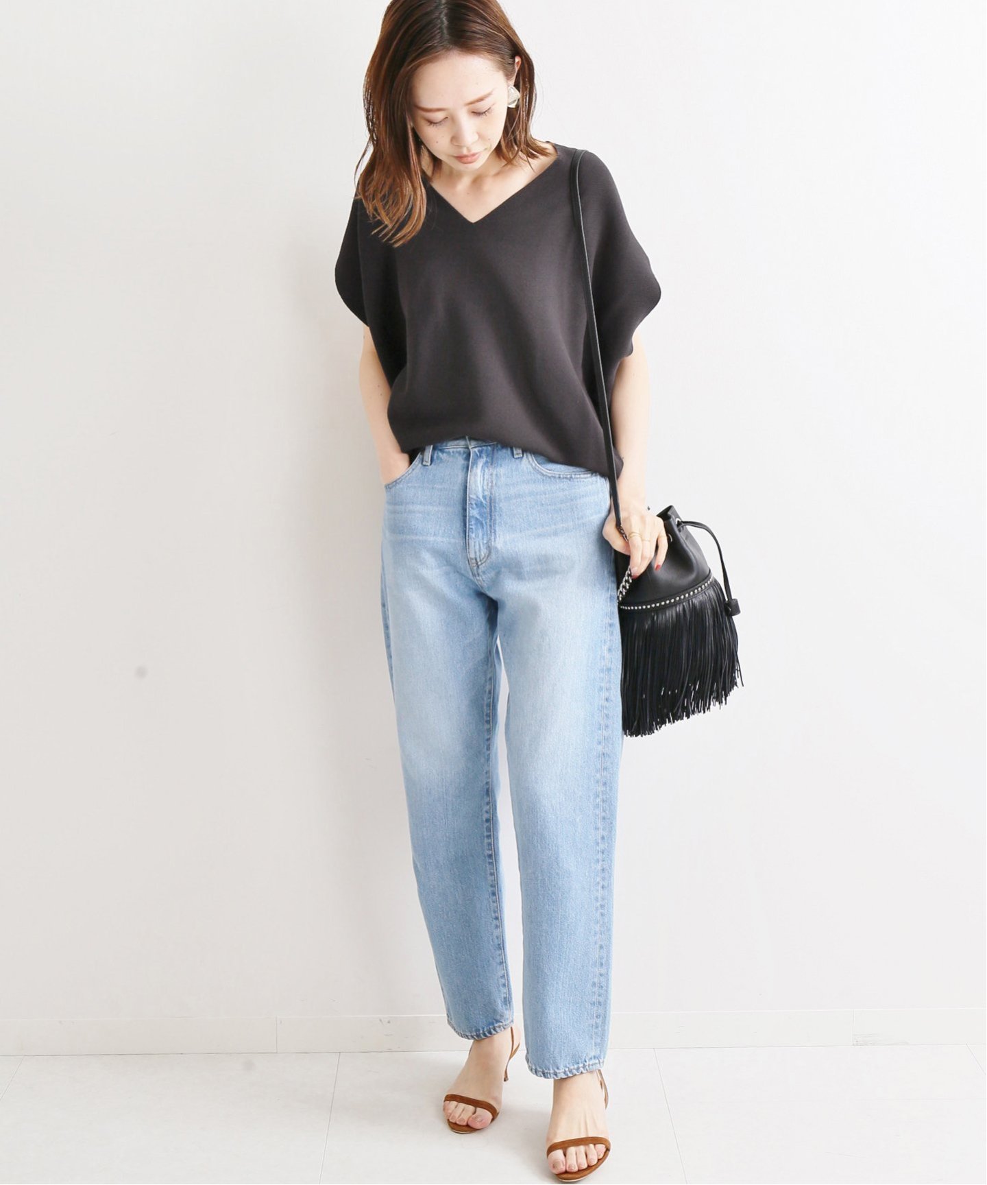 如果腰部與大腿根部都是你特別在意的部位的話,中高腰、繭型輪廓剪裁就是相當適合的牛仔褲款。透過提高腰線可以打造出腰身感,而大腿雙側的微寬繭型設計可以把繞人困擾的大腿肉都隱藏起來。建議還可以特別挑選長度落地的款式,就能順道將腿長問題也一併解決。