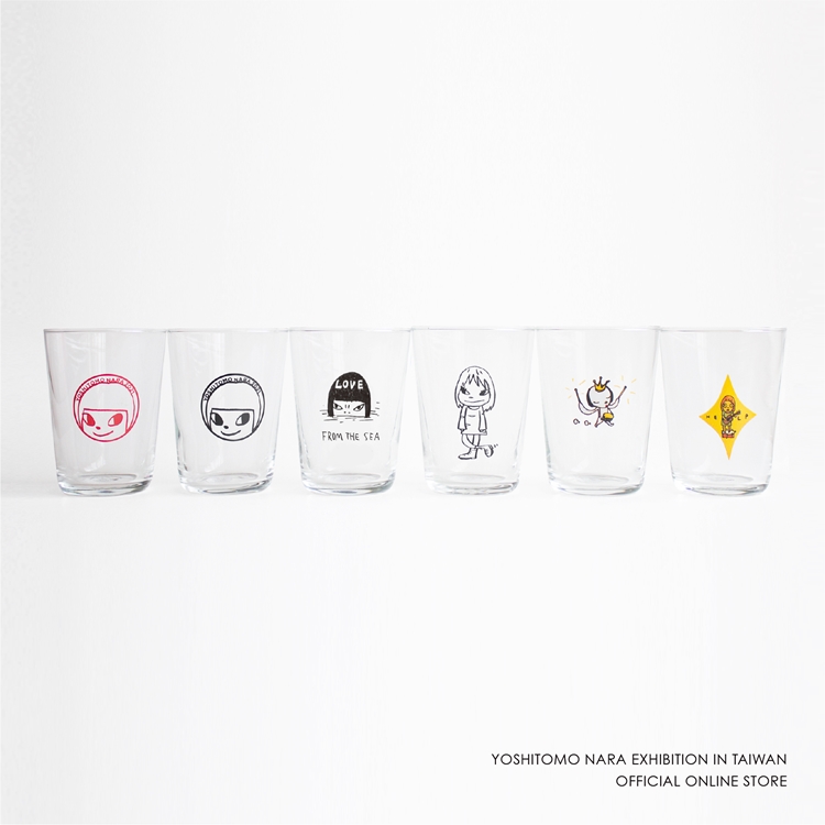 奈良美智玻璃杯共有6種款式,大部分用經典的「小女孩」作為設計元素,大大的眼睛,帶點慧黠的神情相當吸引人,還有將星形木板作品《HELP》彈著吉他、眼神迷茫的少女納入其中。此外奈良美智的另一個經典icon帶著皇冠的白色小狗也變成玻璃杯了,好想整組包下來啊!