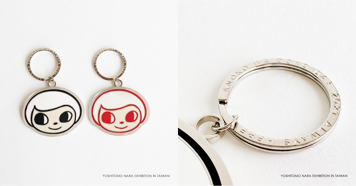 最新登場的鑰匙圈是奈良美智特地為台灣展覽繪製,大概有一個獎牌那麼大,有紅色、黑色兩款,上頭一樣是奈良美智最著名的icon,不過與以往不同的是,有別於之前都是用鉛筆或色筆的筆觸設計,這次適用較粗、較簡單的線條結構,背面還有刻印奈良親手簽名。仔細一看,在吊環上竟刻有一行字,是以日文羅馬標音寫成的「這個孩子在哪裡?」雖然不是正式的名稱,有點像是奈良會寫在素描上的可愛句子!