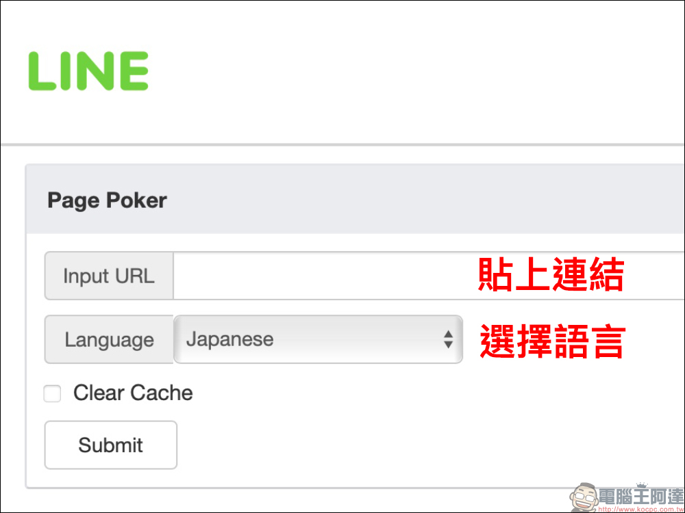 首先,開啟「LINE Page Poker」貼上連結,接著選擇頁面的「語言」。