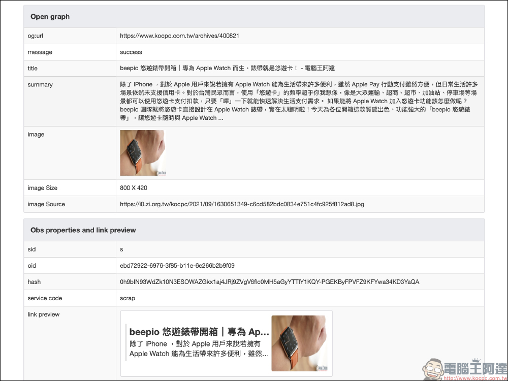 LINE Page Poker 結果頁面會顯示抓取更新時間、回傳代碼、擷取的頁面網址、網域名稱、伺服器 IP 位址等資訊。從 Open Graph 欄位,可見到成功抓取到的網站標題、說明、縮圖、圖片大小和網址。另外,在最下方也提供當網址貼到 LINE 聊天室後的預覽效果。