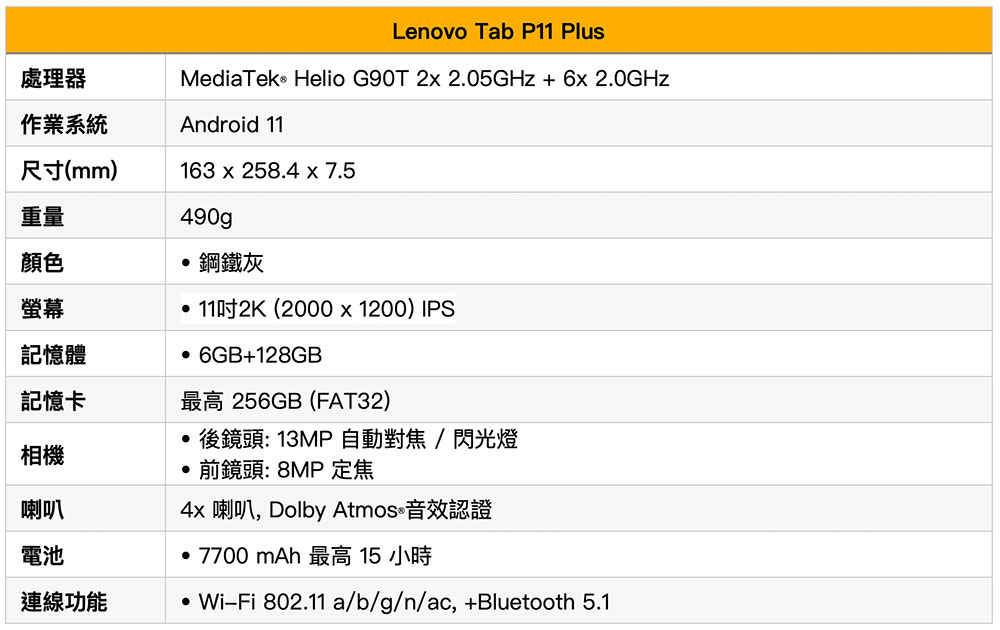 Lenovo Tab P11 Plus 平板為了切合使用者攜帶外出的需求,超輕薄金屬與玻璃纖維混合機身僅 490g。在處理器上採用了 MediaTek Helio G90T 八核心處理器,針對遊戲使用進行優化,以提供更多核心完成複雜的多工運算,加上繪圖效能提升至最高 800MHz,支援雙頻 Wi-Fi 功能,就算是玩遊戲也能快速流暢處理。另外配上德國萊因 TÜV 低藍光護眼認證,在護眼模式下,可以減少有害藍光、降低眼睛疲勞,就算長時間使用也不傷眼。內建 Android 11 系統及 Google Space Kids,對於孩童使用來說也更安全、方便。