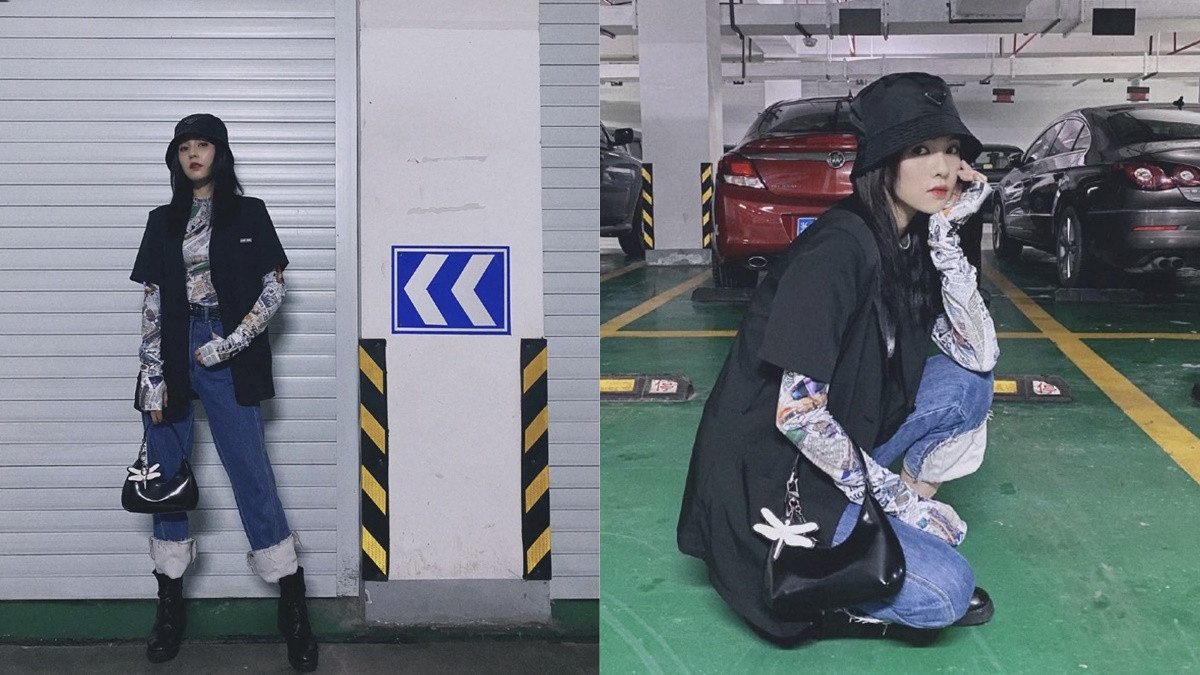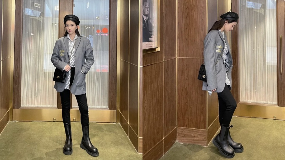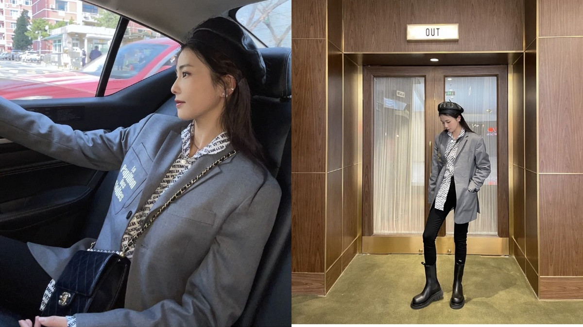 夏末初秋超適合這樣穿!白鹿以Vetements 滿版 Logo襯衫為內裡,外面搭上一件韓國設計師品牌Moonsward灰色西裝外套,還微微拉出一半下擺,巧妙地搭出層次感,最後加上CHANEL 貝蕾帽與小金球珍珠口蓋包,踩上BOTTEGA VENETA軍靴,顯瘦又超有氣場的穿搭真的太好看啦~