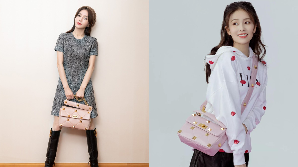 身上揹的這款則是Valentino 人氣IT BAG Roman Stud羊皮鉚釘包,帥氣的鉚釘結合溫柔薰衣紫一點也不違和,可說是可鹽可甜的極致表現,不只白鹿就連秦嵐、唐嫣也被這款神仙美包圈粉。