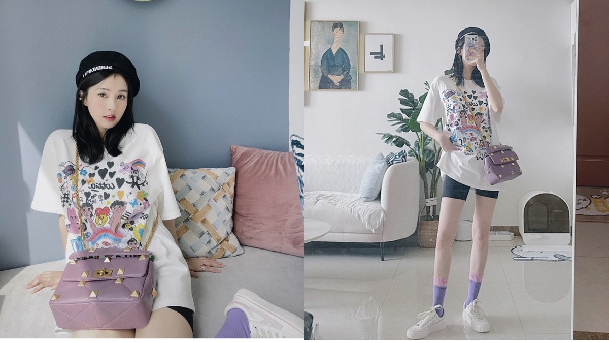 Oversized 寬版上衣搭配單車褲也是今年穿搭趨勢之一!能視覺修飾腿部線條,讓五五身女孩瞬間變成九頭身,白鹿身上這件英國設計師品牌Cottia的印花上衣可鹽可甜超百搭,最後配上紫色長襪,與身上的包款相呼應,完美展現穿搭小巧思。