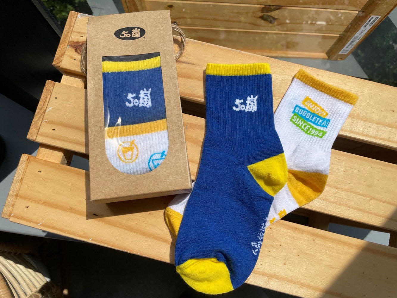 來50嵐不只要帶一杯招牌1號「四季春加珍波椰」,別忘了順帶入手這次推出的限定週邊啊!(笑)襪子採2雙1組,「鐵粉專屬款」相信妞妞們都不陌生,採黃、藍撞色設計,搭配50嵐的LOGO,設計經典又可愛。