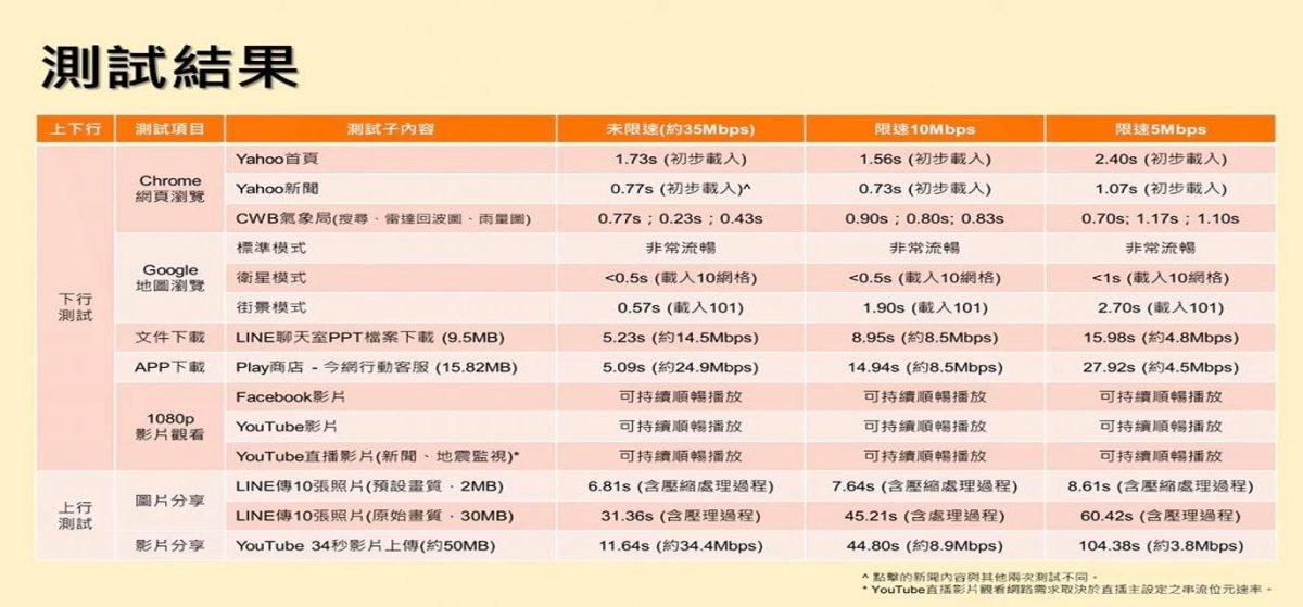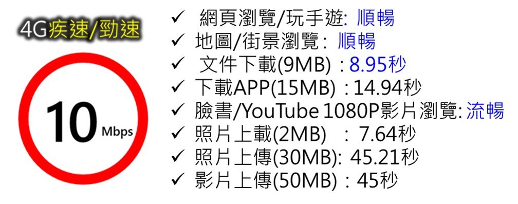 根據知名Youtuber 【愛蓁AiZen 】實測4G不限速/10M/5M網速的結果,10Mbp網速在使用上網瀏覽及觀看1080P影片都相當順暢,足以應付多數日常上網所需。下載或上傳較大型檔案速度會比不限速方案慢一些,但仍在可以接受範圍內。