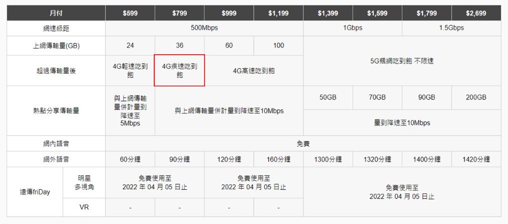 是故,遠傳電信即日起將5G 799資費每月使用行動上網用量超過36GB後,降速至10Mbps(原本為5Mbps)。