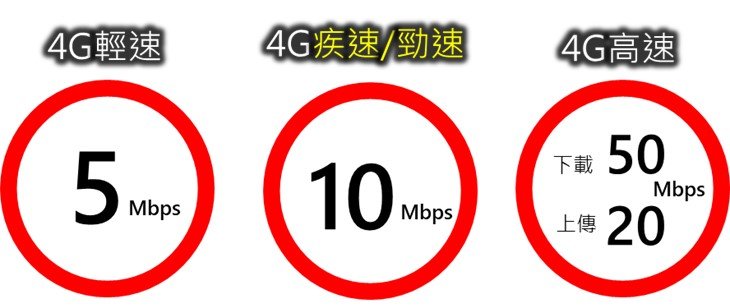 根據「遠傳電信官網」說明,【4G輕速上網吃到飽】係指傳輸速率最高5Mbps;【4G疾速上網吃到飽】係指傳輸速率最高10Mbps;【 4G高速上網吃到飽】係指傳輸速率最高50Mbps(下載)/20Mbps(上傳)。