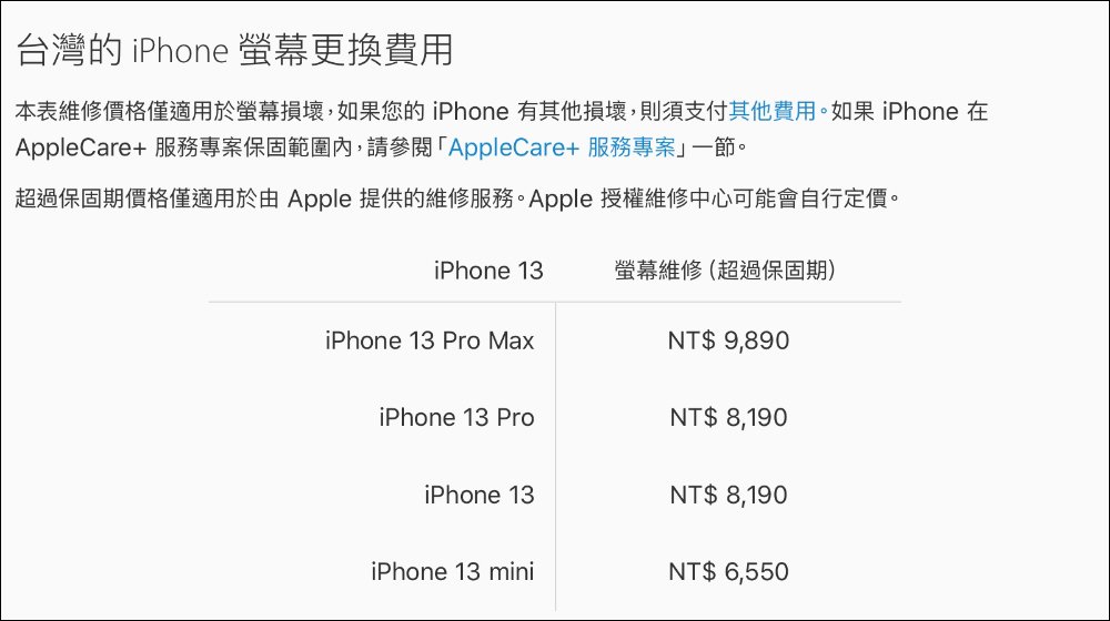 其中 iPhone 13 Pro Max 的螢幕維修價格最貴為 9,890 元、 iPhone 13 Pro 和 iPhone 13 螢幕維修價格為 8,190 元,以及 iPhone 13 mini 螢幕維修價格則為 6,550 元。