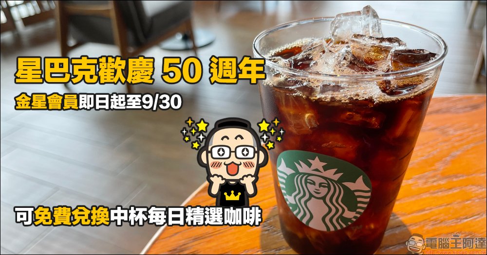 星巴克歡慶 50 週年!金星會員即日起至 9/30 ,可免費兌換中杯每日精選咖啡