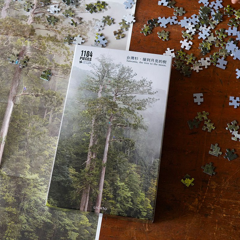 接下來這款拼圖的主題很特別,取名為「撞到月亮的樹」,其實拼圖中的「樹」指的是台灣杉,因為台灣杉的外型高大挺拔,在清晨還看得到月亮的時候,看起來就像是快要撞到月亮的樹哦!