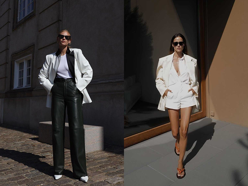 黑色西裝外套穿出經典的形象,白色的西裝外套則是展現時髦品味的象徵。無論春夏秋冬,擁有一件白色西裝外套絕對勝出,夏季時以同色系的穿搭製造整體性,配上一雙撞色的鞋款或飾品,將全身重點放在服裝單品上,看起來既清爽又不失態度。而秋冬時,全身白往往會看起來過冷、過輕、沒有重點,此時搭配一些秋冬元素,例如皮革、高領上衣、腰帶,平衡全身的比重。