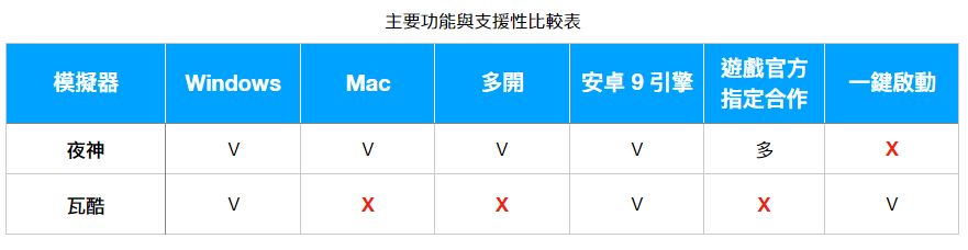 夜神 vs 瓦酷主要特色比較表