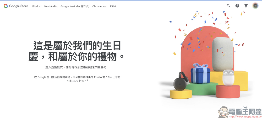 一年一度的 Google 生日慶活動開跑囉!在即(25)日起至 9 月 27 日期間,於 Google 官方商店購買指定商品輸入折扣代碼即可享最高 5 折優惠。另外,凡是在 Google 生日慶活動期間有購買商品,即可獲得 Google Pixel 6 / Pixel 6 Pro 折扣代碼,在未來 Pixel 6 系列推出後現折 NT$1,400 !