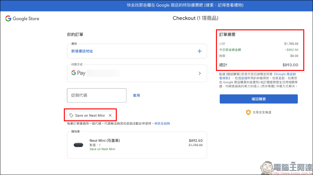 即日起至 2021 年 9 月 27 日 23:59 前於台灣 Google 商店購買 Nest Mini(第 2 代) ,輸入折扣碼「MINIBUTMIGHTY」即可享 NT$893 優惠價(原價 NT$1,785 ,現省 NT$892)。本優惠不得與任何其他促銷代碼或其他同一檔期的搭售優惠和即時折扣合併使用。