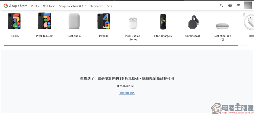 即日起至 2021 年 9 月 27 日 23:59 前於台灣 Google 商店購買商品,輸入折扣碼「BDAYSURPRISE」即可享 85 折優惠價。本優惠不能使用於購買 Pixel 手機。