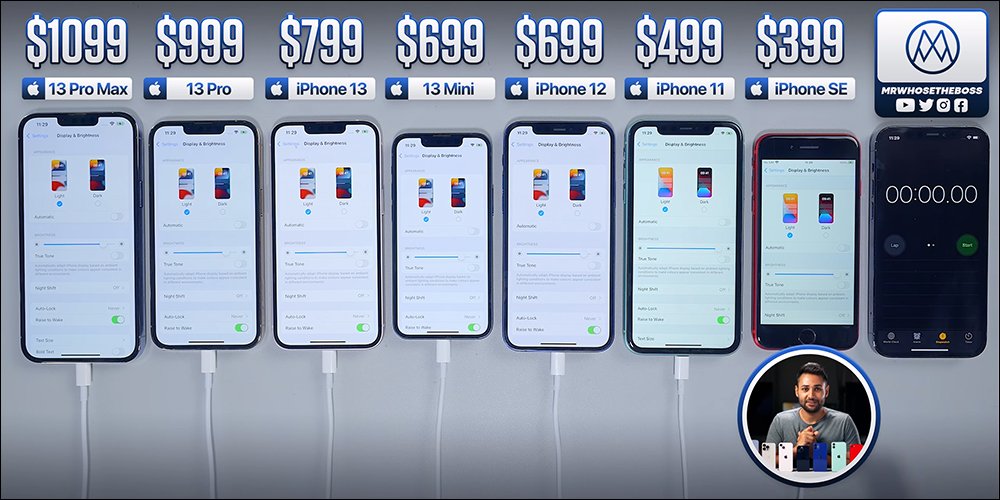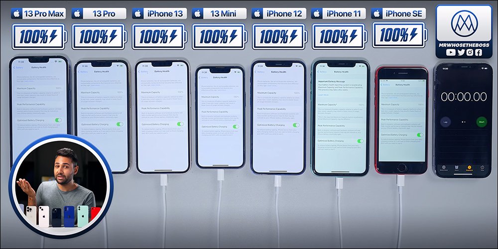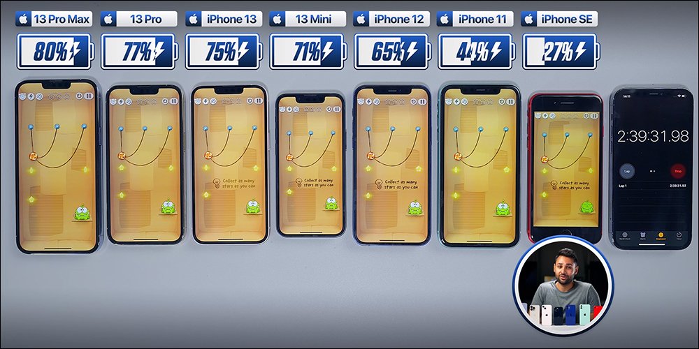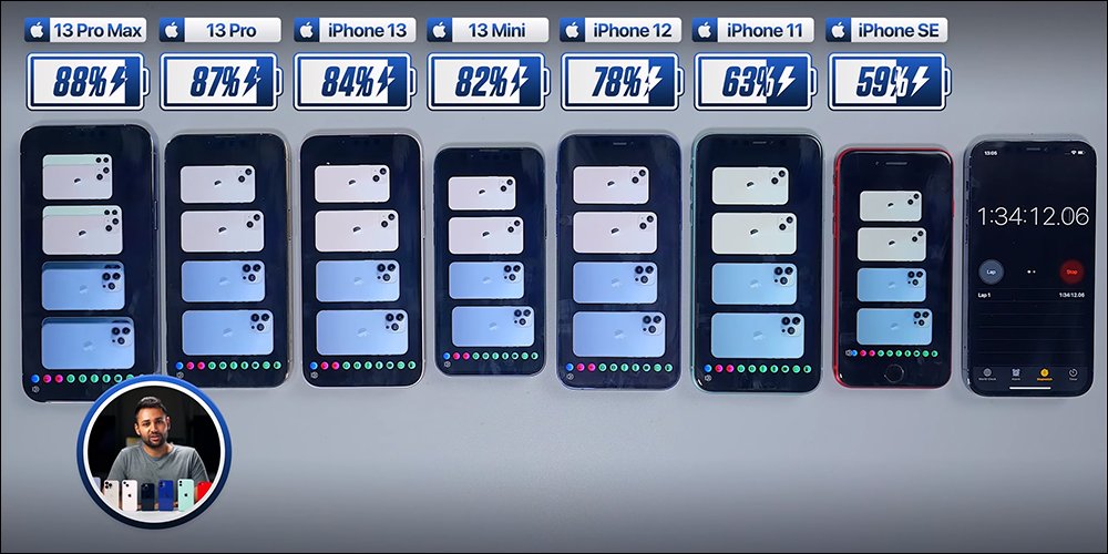 最近英國的 YouTuber Mrwhosetheboss 也帶來了 iPhone 13 系列和過去幾代機型的電池壓力測試,要實測在 iPhone 充滿電、電池健康度 100% 、亮度相同的前提下,螢幕不休眠持續使用多久。