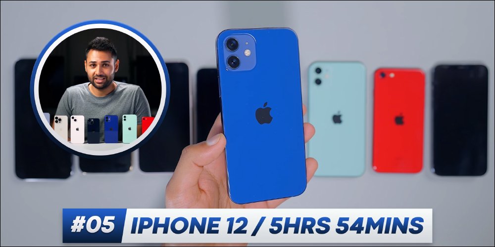2020 年 Apple 推出的 iPhone 12 ,搭載 Apple A14 仿生晶片、 6.1 吋超 Retina XDR 螢幕(OLED)、內建 10.78Wh 電池,測出能連續使用 5 小時 54 分名列第五名。