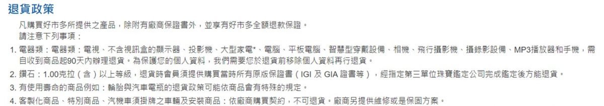 根據台灣法規規定,在網路購物可享七天鑑賞期,好市多COSTCO甚至有 90天內可無條件退貨的政策。