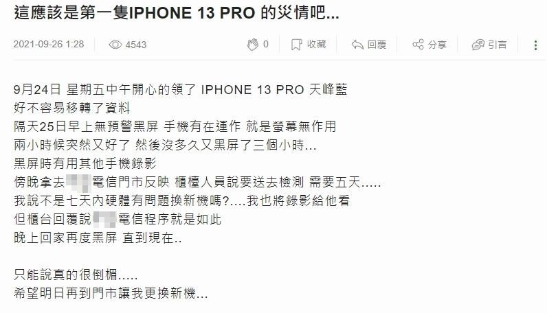 APPLE iPhone13系列台灣已經正式開賣,除了已經傳出”第一摔”外,有網友在《Mobile01》上,以「這應該是第一支iPhone 13 Pro的災情吧」為題發文,提到他開賣當天開心地將iPhone 13 Pro天峰藍帶回家,結果舊機資料好不容易都轉過去了,隔天一早新機就無預警黑屏,遇到新品故障的機王,打算到門市要求新品換貨。