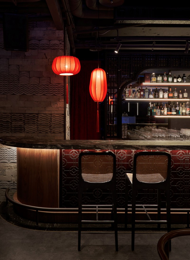 首先吧台酒牆是明月(銅板質地,古代的鏡子是使用銅製品)及雲霧的概念,坐在吧檯的人,會有舉杯望月的畫面,吧台檯面則選擇仿古面石材(潑墨山水大理石),而左右的柱子是訂製的磚瓦片,以不同的形狀堆疊出復古斑駁的韻味,最後再搭上紅色的燈籠點綴出東方的味道。