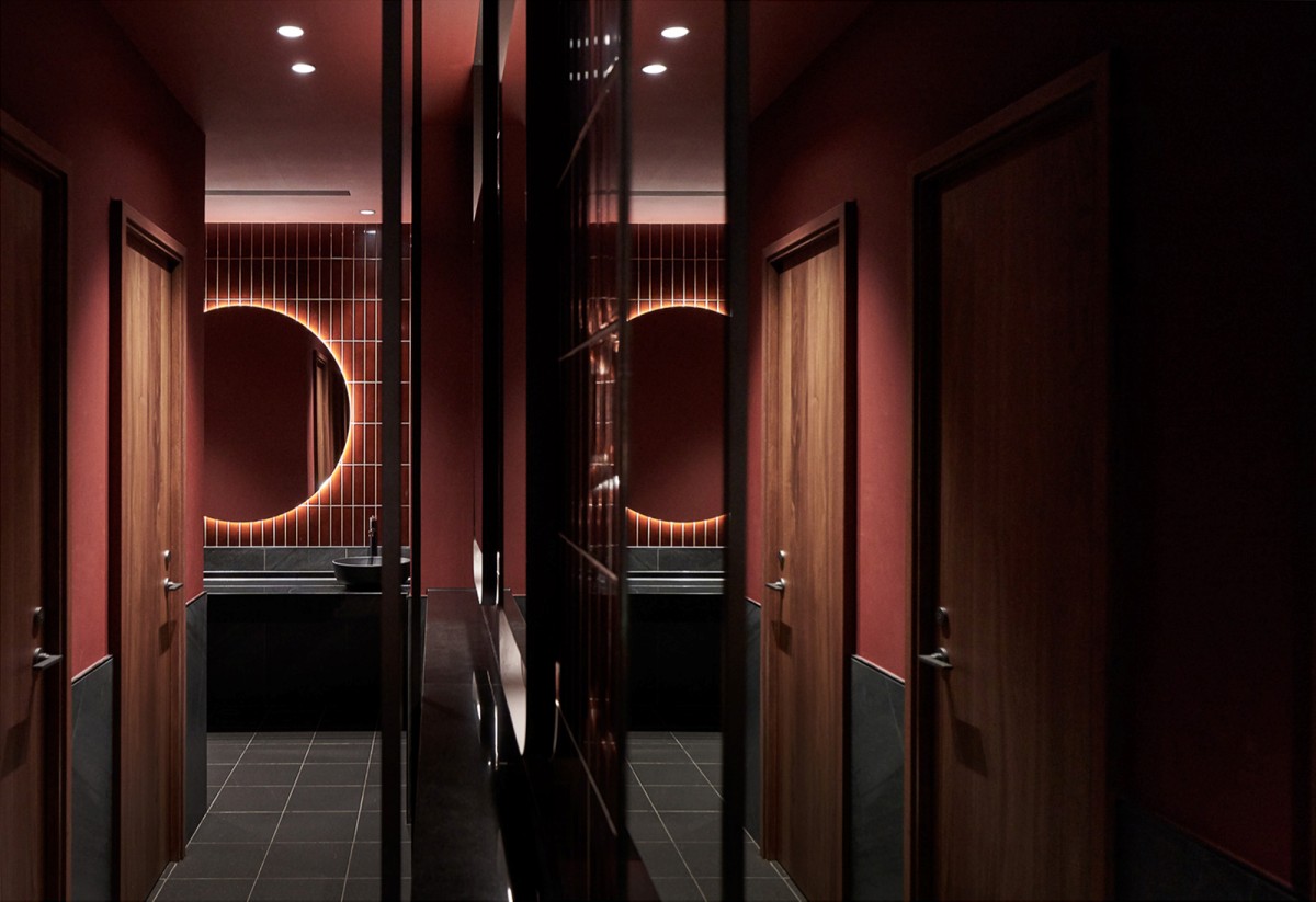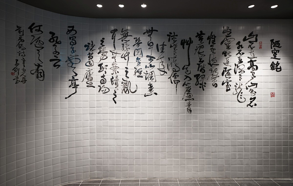 廁所部分一踏入就能看到一面書寫字體陋室銘,這也是藝術家至現場書寫的,男女廁都是以紅色為主,圓鏡呼應明月。