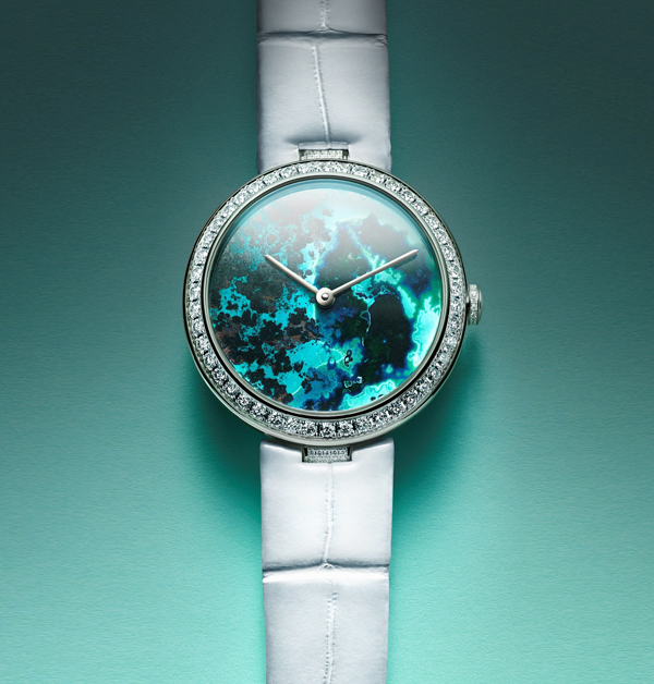 Chaumet「Pierres de Rêve」腕錶系列,讓每一款錶盤材質都美得不像話:有如玉般光澤的「蛋白木化石」、呈現粉桃色的「薔薇石」、形成針狀晶體叢集而成的「藍矽銅礦」等,使錶面乍看之下,宛如一處處夢幻的神祕之境,或許是山谷、雪景、沙漠、浪濤,還是鐘乳洞…在簡約的錶觀中,透過這些絕美如景的錶盤,激起觀者強烈的情感波動。