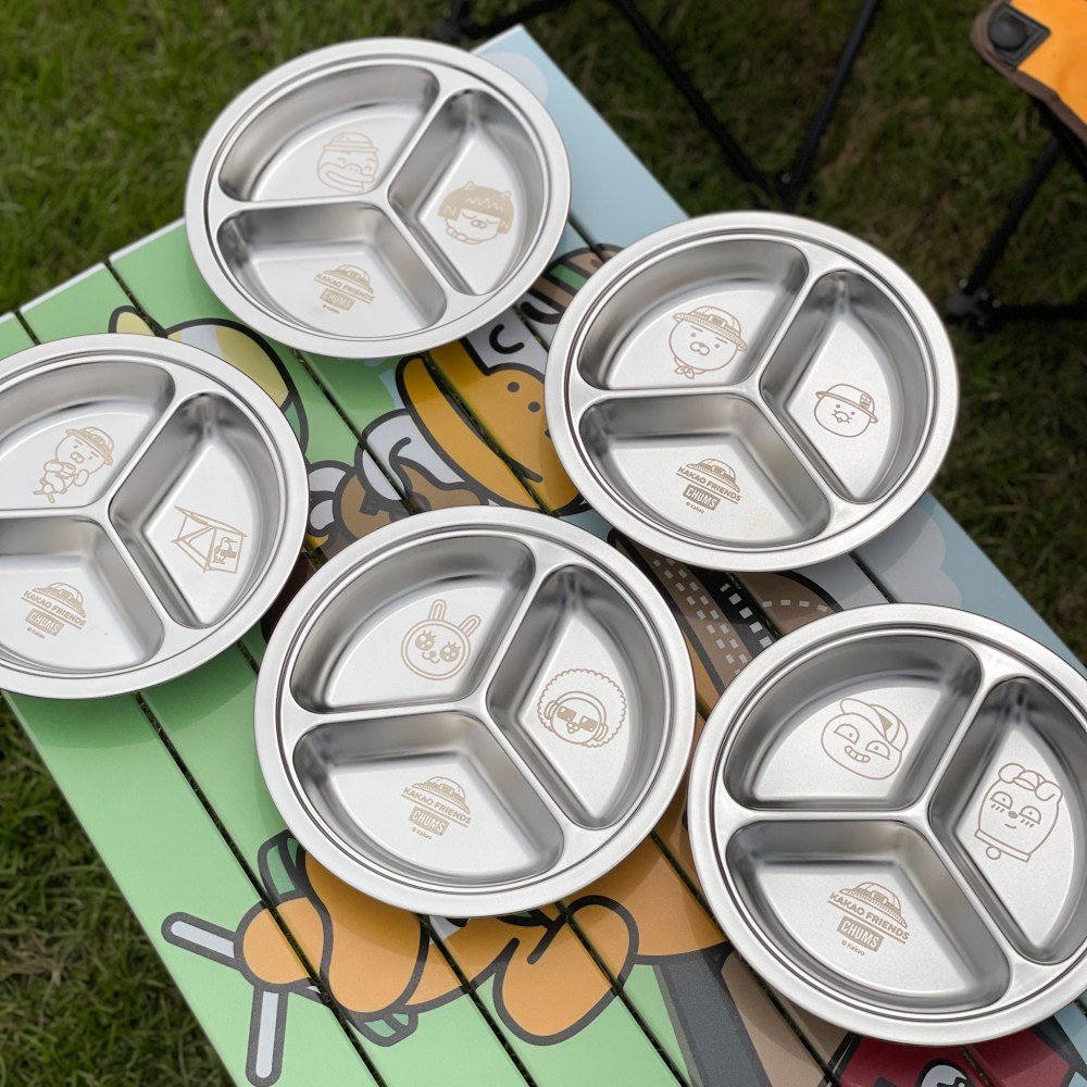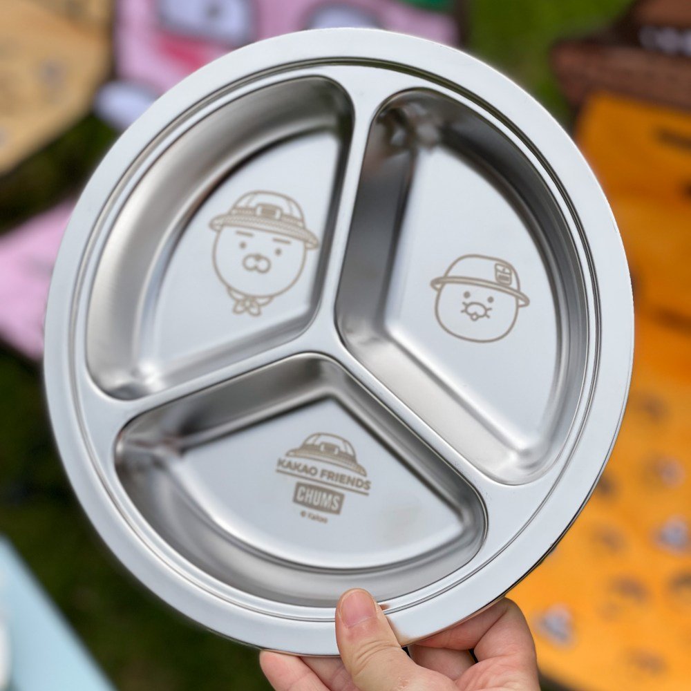 餐盤也是超級可愛(笑),採圓形造型、3格設計,每格以雷射雕刻呈現萊恩、春植、啵啵桃(APEACH)、爆走鴨(TUBE)、FRODO、NEO等角色,與杯子一樣可堆疊收納,攜帶方便。
