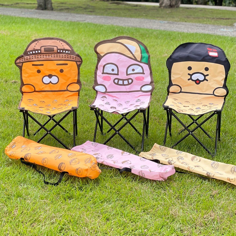 露營時怎能少了折疊椅!椅子共有萊恩、APEACH與春植貓3款選擇,造型椅背相當吸睛,隨附收納袋可輕鬆攜帶。(帶去海邊也很可以耶)