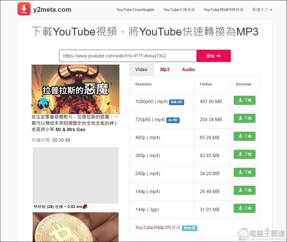 接下來就會看到下方有「Video」、「MP3」、「Audio」三種選項可以選擇下載,而影片的部分可以直接下載 1080p 60 的 MP4 格式,真的很不錯。