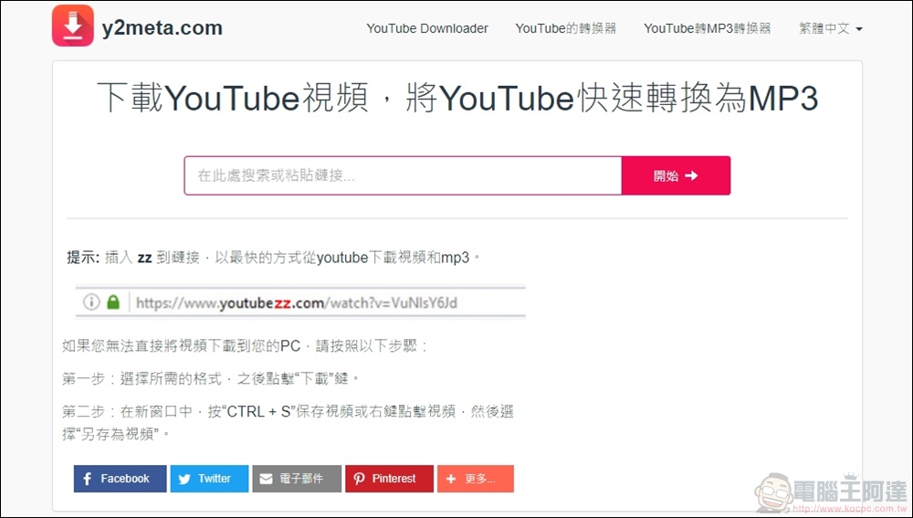 首先進入 y2meta 網站後,就可以看到可以直接輸入網址的地方,直接把想要下載的 Youtube 影片與 MP3 音樂網址貼上,並且按下「開始」即可。