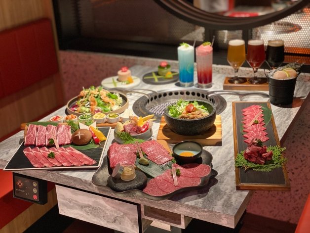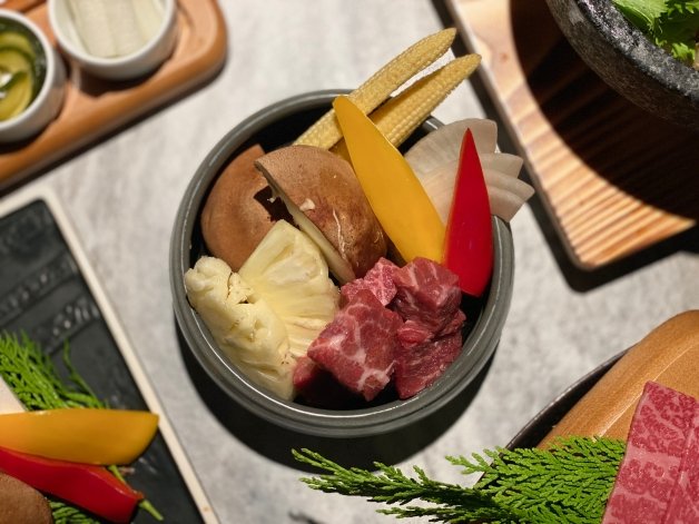 獨家「漬物六小福」包含燒肉必備的蔥鹽、微酸爽脆的大根、香辣解膩的韓式泡菜、清爽多汁的黃綠櫛瓜、重口味最愛的大蒜辣椒、酸甜不澀的黃檸檬等,妞妞們可以「骰子牛+味噌醬」、「牛五花+水果醬+黃檸檬」、「雪花牛+味噌醬+大根」、「豬五花+櫛瓜」、「伊比利豬+大蒜」、「豬梅花+五味唐辛子+辣椒」等,動手玩肉,將食材、沾醬和漬物創意搭配!