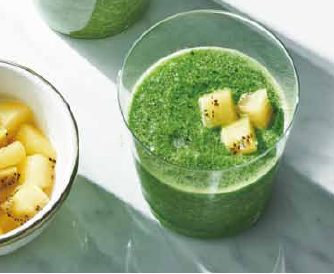 小松菜和荷蘭芹含有豐富的鈣質和鐵,而黃金奇異果的維生素C成份比綠色奇異果高出許多,對於鐵質和鈣質的吸收很有幫助,蒟蒻果凍的食物纖維則能夠增加口感和飽足感。這道蔬果汁食譜的組合適合生活中壓力較大,有時候可能會有貧血困擾的上班族。