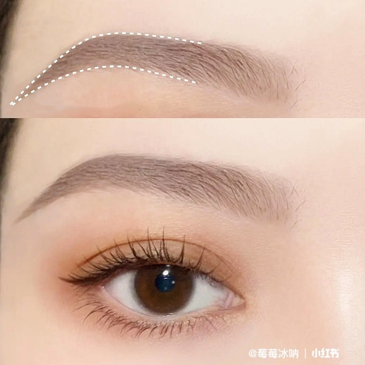 還有一點很重要的就是眉毛的粗度,這樣的眉型總體會顯得比較柔和自然、粗度適中,粗細可以大約畫到眼睛睜開後的高度1/3或是一半都可以,只要輕微調整弧度、顏色、眉距也可以有不同風格,這種圓弧眉型因為畫的比較長,在視覺上非常修飾圓臉,另外圓弧的眉峰也有修飾稜角的效果,像是長臉、高顴骨、圓方臉都很推薦!