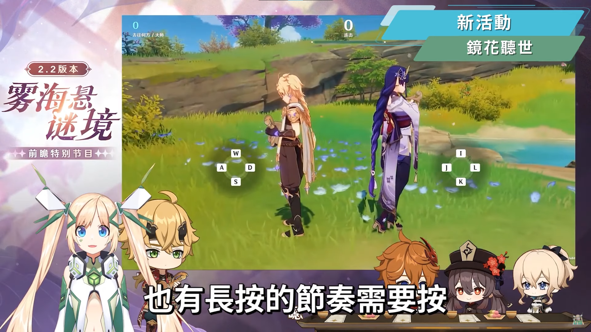 新活動鏡花聽世又是一個要玩音Game的活動,完成活動後可以獲得來自萬葉的禮物-鏡花之琴,不同於之前風花節的風物之歌活動,這次的彈奏可以和遊戲內的角色一起合奏歌曲,一共有7首歌曲,這次的譜面也和先前的音Game相較起來更加不同,雙手並用點擊之外,也有長按的節奏需要按。