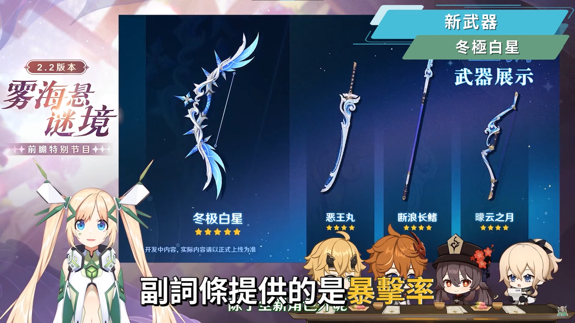 新的五星弓冬極白星,從外型上來看應該就是黃金屋周常副本中公子在第一階段所拿的那把弓,副詞條提供的是暴擊率,和天空之翼不同的是,同為90等的情況下,冬極白星的基礎攻擊力為608,暴擊率為33.1%,而天空之翼的基礎攻擊力為674,暴擊率為22.1%,另外冬極白星的被動效果是讓E和Q技能造成的傷害提高12%,並且每當普攻、重擊、E技能、Q大招命中敵人後,都會產生1層的白夜極星效果,持續12秒,最多可以疊加4層,層數疊滿後最高可以帶來48%的攻擊力加成,光看被動效果就非常的和公子契合,更甚至比起同等級的天空之翼更好,副詞條也提供比起天空之翼更高的暴擊率加成,也算是非常萬用的輸出弓,若是要給打輸出位的弓系角色來說都很不錯,而若是要說宵宮的話還是飛雷之弦振最好,只是若當初沒有抽到飛雷的話,也是可以給宵宮用。