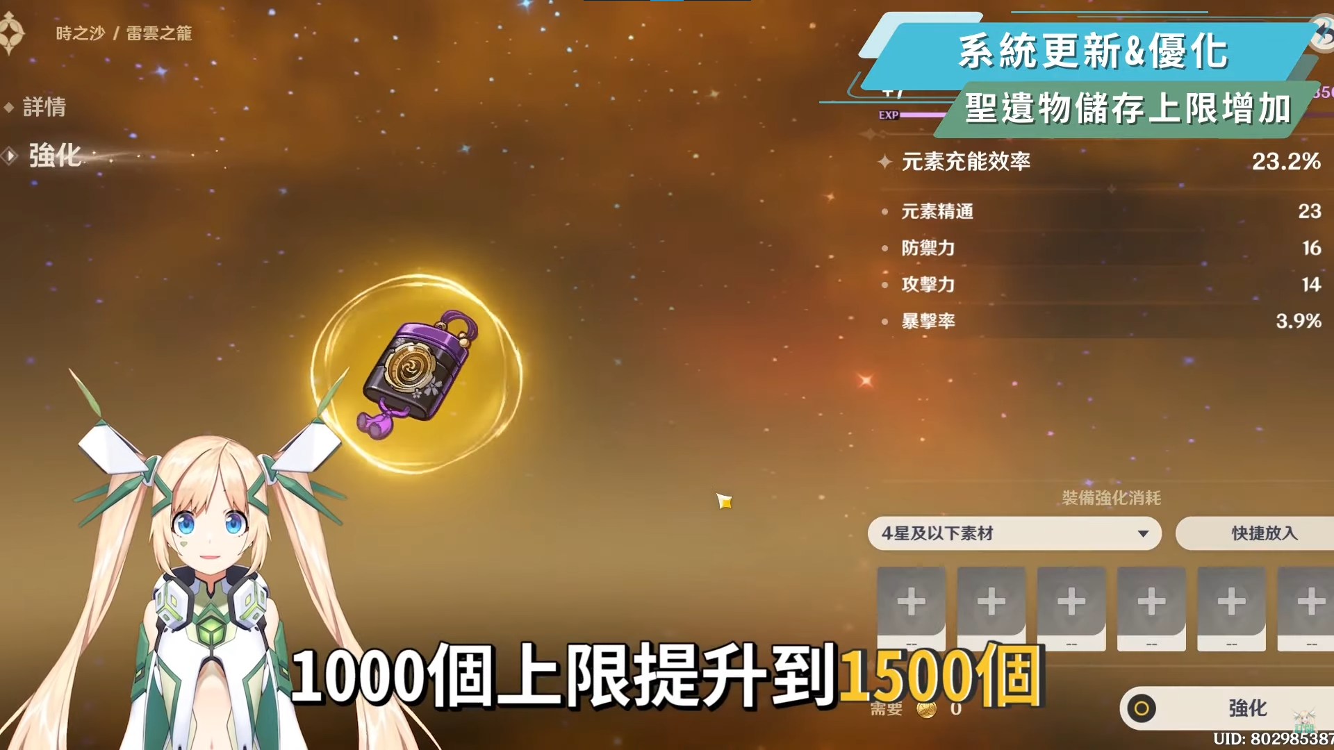 另外一個優化是關於聖遺物的儲存上限也會從原本的1000個上限提升到1500個。