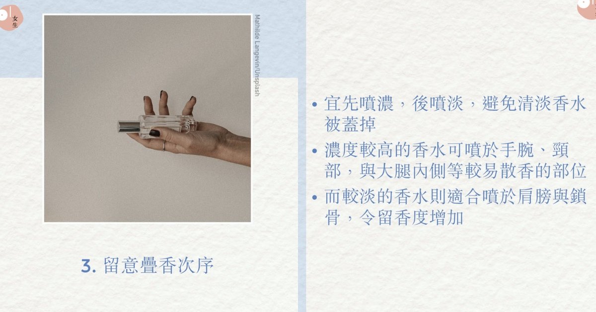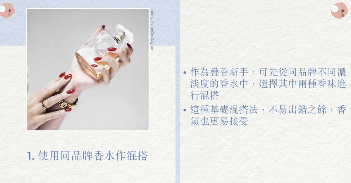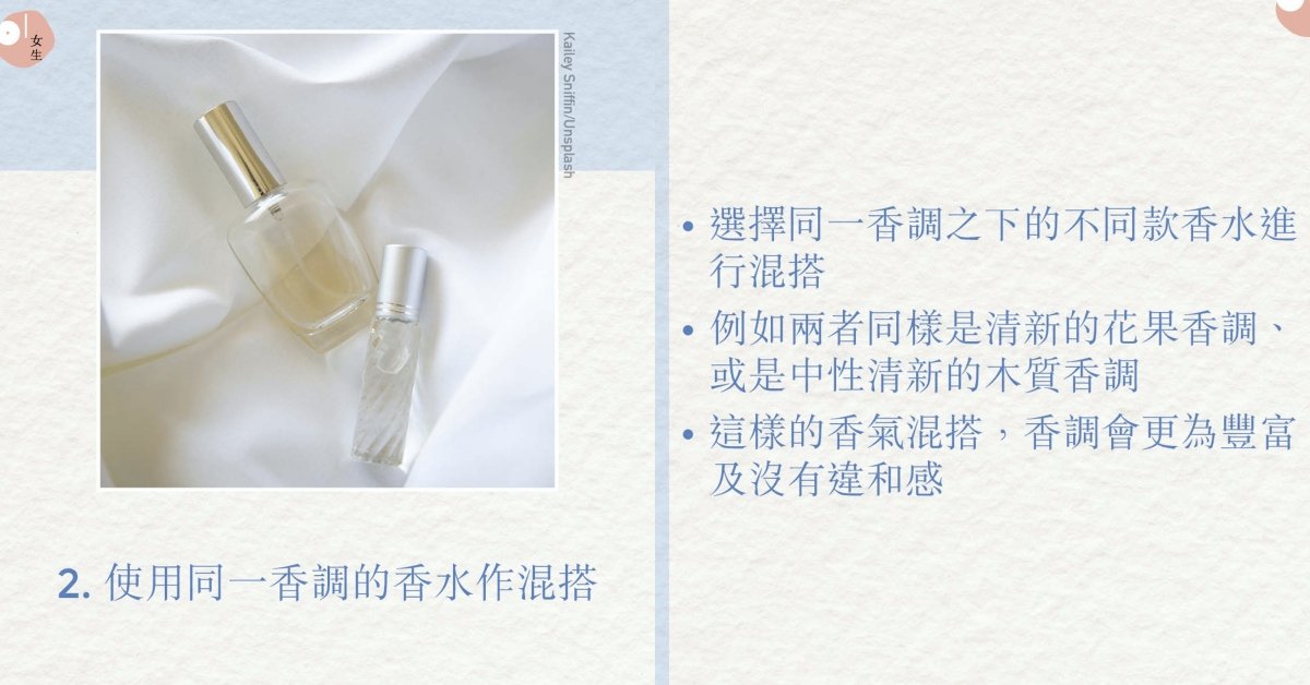 若然不想只局限於同一香水品牌,可儘量選擇同一香調之下的不同款香水進行混搭,例如兩者同樣是清新的花果香調、或是中性清新的木質香調。這樣的同香調混搭法,可使香氣更為豐富及沒有違和感。