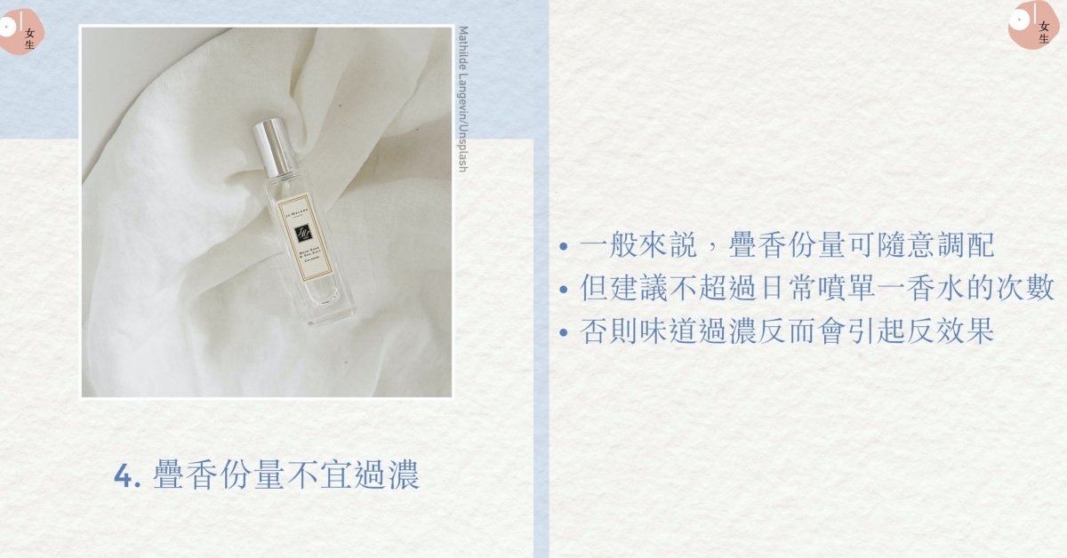 作為疊香新手,可留意幾點香水混搭技巧,以免調出的香氣變得難聞刺鼻。大家可以先從同一品牌中,選擇其中兩種不同濃淡度的香味進行混搭,由於同品牌所推出的香氛大多風格相似,以這種基礎混搭法來疊香,不易出錯之餘,香氣也更容易接受。