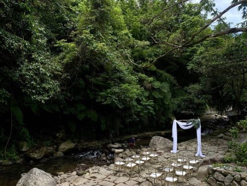 這樣的證婚場地太酷了吧?福田園位於士林區的山谷裡,放眼望去都是綠意盎然的樹林,而證婚場地更是在溪水邊,聽著潺潺水聲、許下一生的誓言。室內用餐區更是在日式平房建築內,濃濃的日系婚禮風格~
