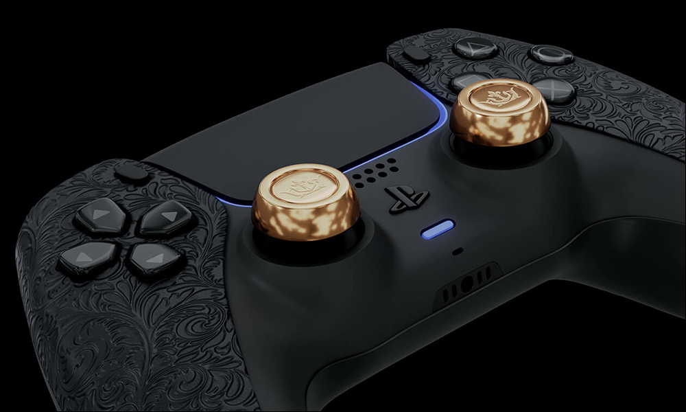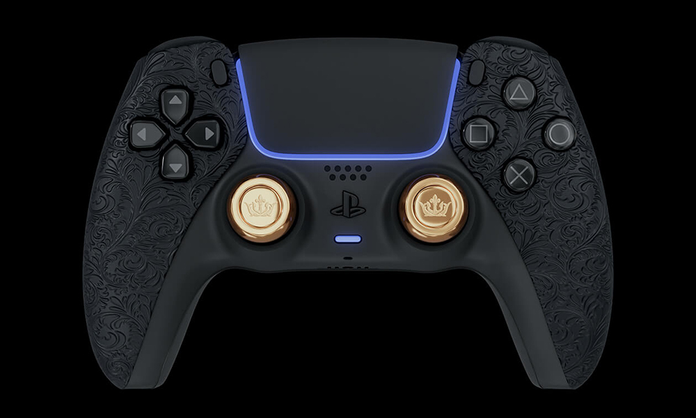 除了 PlayStation 5 主機本身,在 PS5 搭配的 DualSense 無線控制器外觀也進行了大改,採用黑色真皮覆蓋並押上相同的精緻紋理,讓手感更舒適。另外,蘑菇頭類比搖桿鍵採用金色,表面有 CAVIAR 的品牌 Logo 。