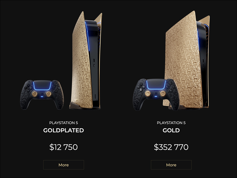 如果覺得 18K 金黃金版的 PlayStation 5 售價 352,770 美元(約合 979 萬元新台幣)太過昂貴,其實 CAVIAR 也同步推出「平民版」的類似產品,表面採用 24K金鍍金而非實心黃金,售價「只要」 12,750 美元(約合 35.3 萬元新台幣),限量生產 99 台。