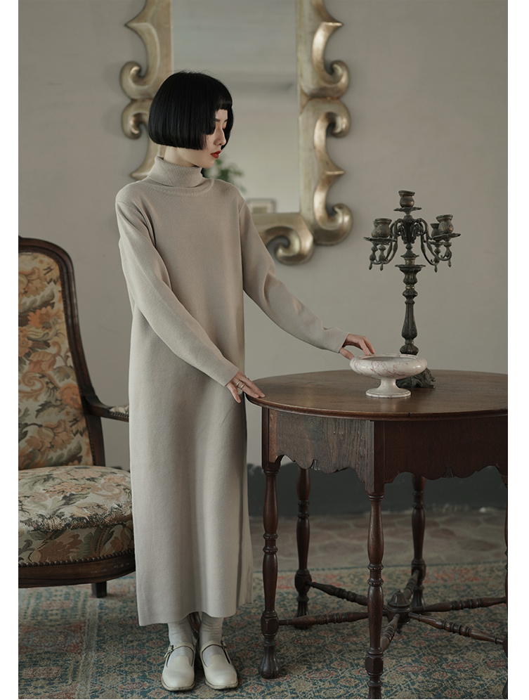秋冬百搭針織單品一:小高領燕麥色針織秋冬長袖洋裝
