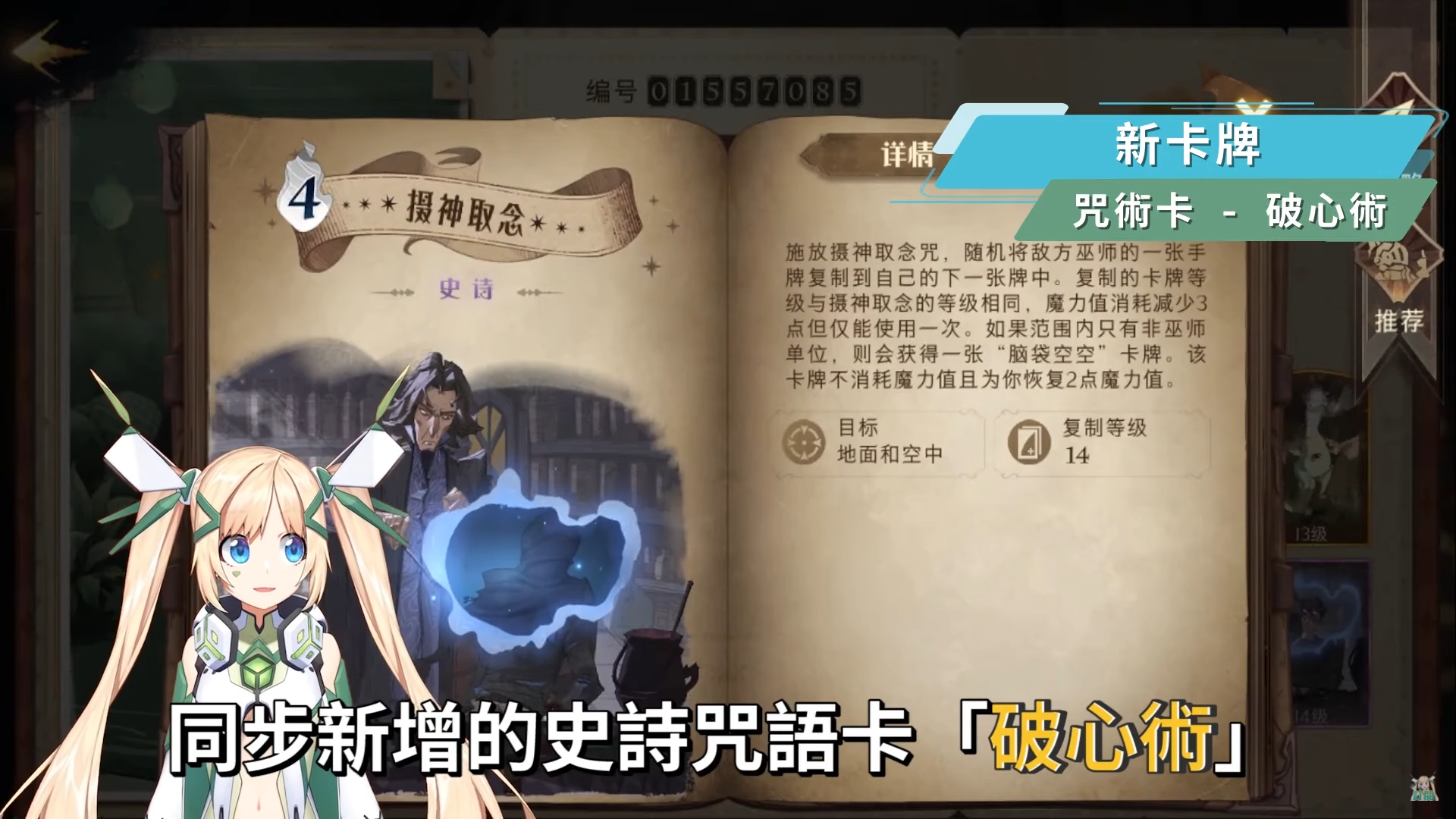 同步新增的史詩咒語卡「破心術」,主要的玩法就是偷取對方手牌上的隨機一張牌,複製的卡牌等級會和你持有的破心術卡牌等級相同,而魔力值會再減少3點,並且只能使用一次,若施咒的範圍內只有非巫師單位,則會獲得一張陸服名稱是「腦袋空空」的卡牌,雖然不確定台服的翻譯是什麼,但應該是「空空遺忘」吧,看到腦袋空空不禁噗哧笑了出來,這張牌主要是用來回魔,打出後可以直接回復2點的魔力,因此使用技巧上最好務必讓咒語選中的範圍要是巫師。