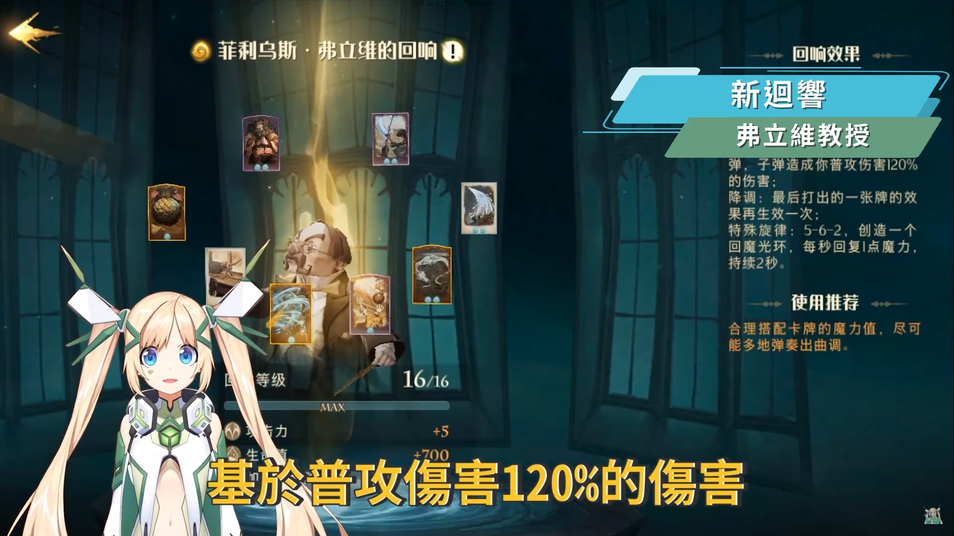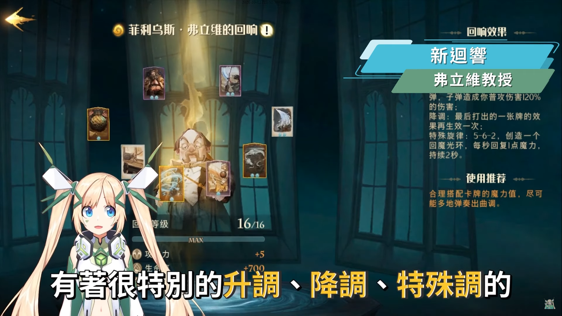 這次更新後也新增了全新的迴響弗立維教授,身為弗咒學教授的他其實也是負責霍格華茲學生們組成的交響樂團跟合唱團的總指揮,也因此在弗立維教授的迴響中,有著很特別的升調、降調、特殊調的出牌方式,一開始用的話可能會有點搞不太懂,但只要把卡牌上的魔力值想像成是音符,數字越高代表音調越高,數字越低代表音調越低的概念,當我們要打出升調的效果時,就可以依序打出三張牌是由低的費用到高的費用,像是2-3-6,4-5-6的牌都算是升調,打出升調效果後將會依據最後一張打出的魔咒魔力值,打出對應數量的音符子彈,金色迴響弗立維的子彈每發可以打出基於普攻傷害120%的傷害,而且若你最後一張打出6費的卡就可以打出6顆子彈,非常OP,下課趕快衝禁忌森林了!再來降調就可以是6-5-4、4-3-2這樣的出牌方式來達到降調,達到降調效果就可以讓最後使用的魔咒再生效一次,另外弗立維教授還有一個特別的特殊調效果,需要按照5-6-2的魔力值出牌順序,此時就會創造一個回魔光環,使我們每條可以回復1點魔力值,持續2秒。