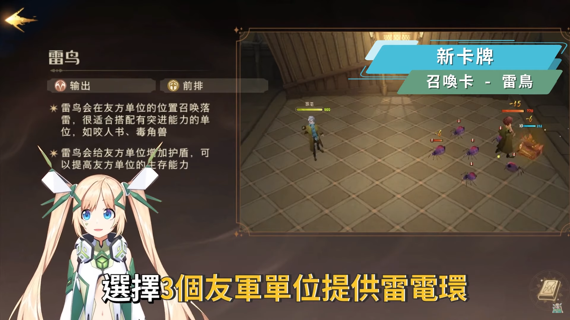 這次更新後新增了新的史詩卡牌「雷鳥」,卡牌特性是能夠在每隔一段時間選擇3個友軍單位提供雷電環,並且在一段時間後引爆,同時友軍單位也會附加護盾。雷鳥的使用搭配可以是用怪獸書或三本怪獸書迅速衝到敵方面前時,搭配召喚雷鳥就可以使單位附近形成雷電環並引爆,若對方此時召喚出召喚物出來會正好被雷鳥引爆的雷電環傷到,另外要注意的是雷鳥的生命值並不高,因此最好不要第一時間就召喚出來,又或是最好確保前方有保排單位或是解場的咒術卡,且根據陸服敘述,後續雷鳥也是有機會可以在拼圖尋寶活動中獲取的哦!而根據陸服的卡組搭配,也有看到許多玩家有將雷鳥配置在弗立維迴響的卡組中。