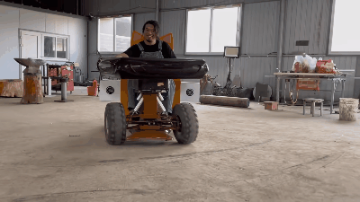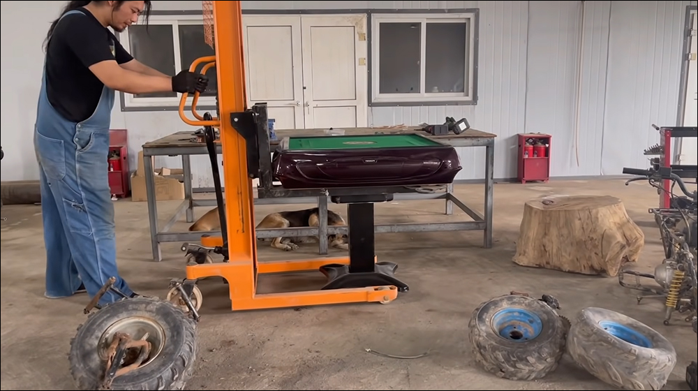 首先是改造電動麻將桌,將它裝上一對越野車的輪胎和避震系統。
