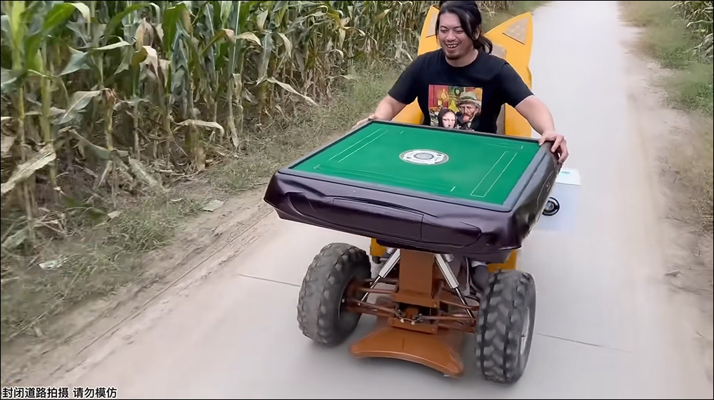 就能開著這輛電動麻將「車」出遊囉!轉向時則是轉動電動麻將桌的桌子當成方向盤。