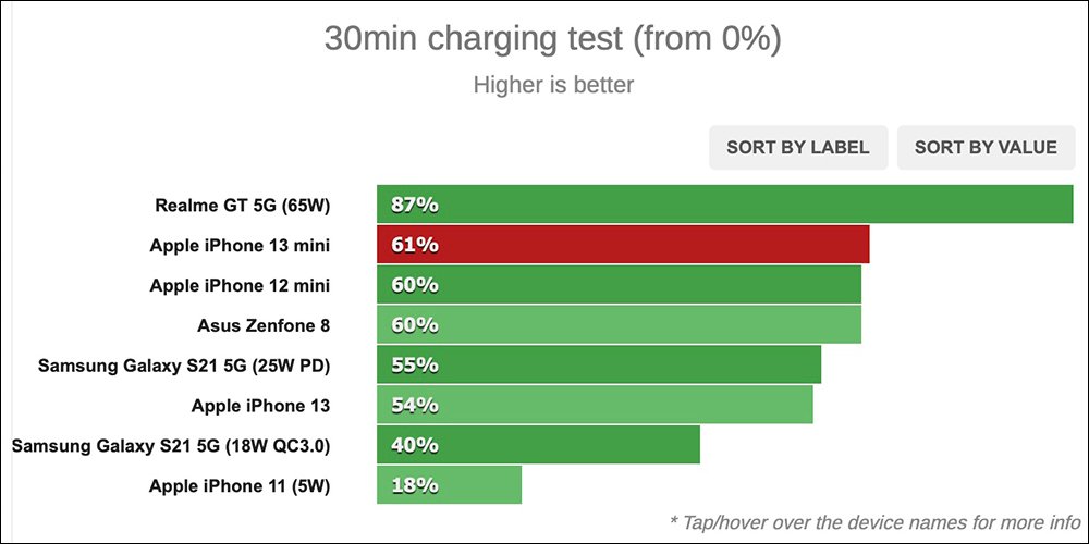 另外,如果使用 Apple 的 20W USB-C 充電器為 iPhone 13 mini 充電,在 30 分鐘約可充滿 61% 電量。